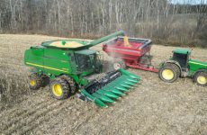 Two John Deere Combines Harvesting Corn Tractor Chasers